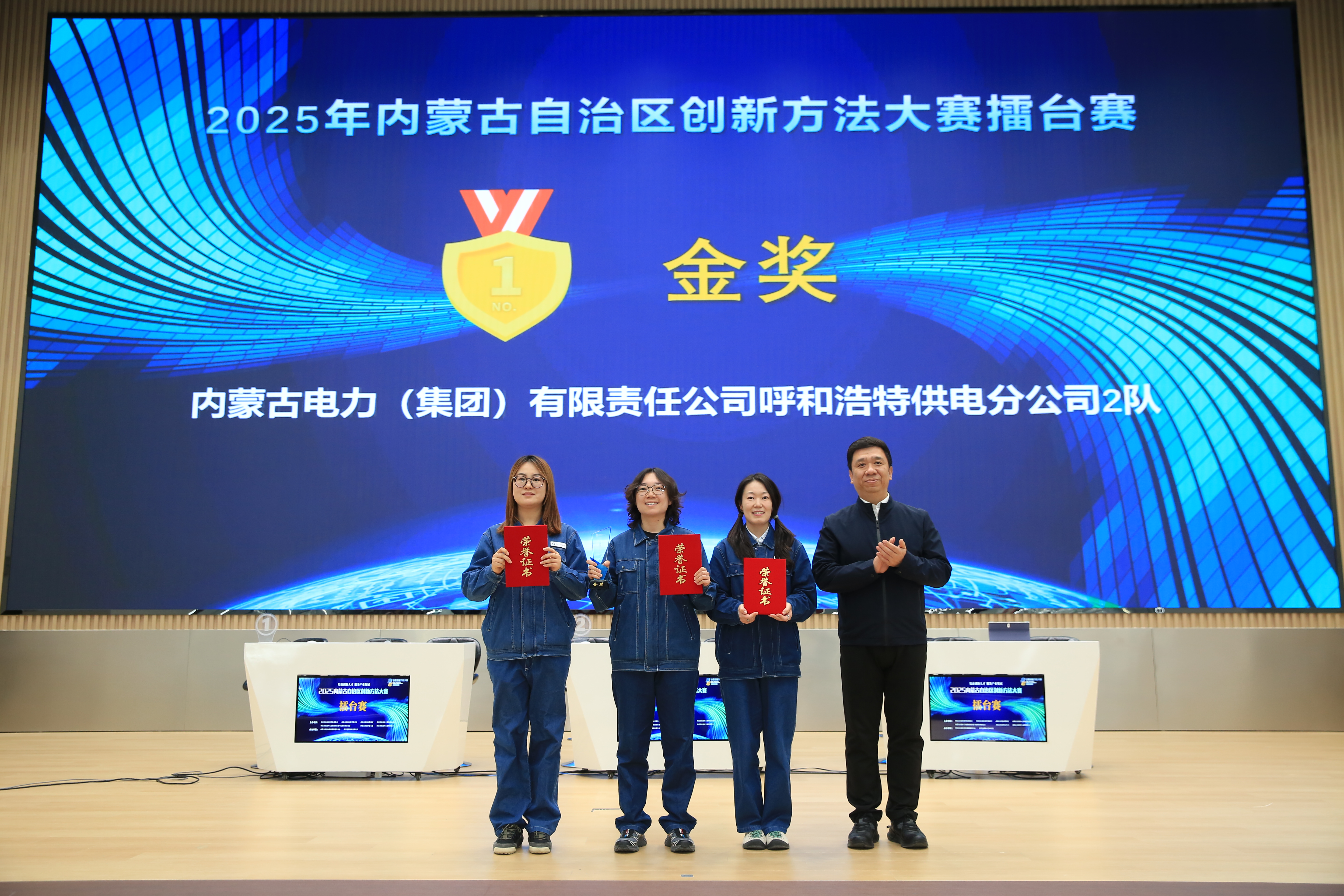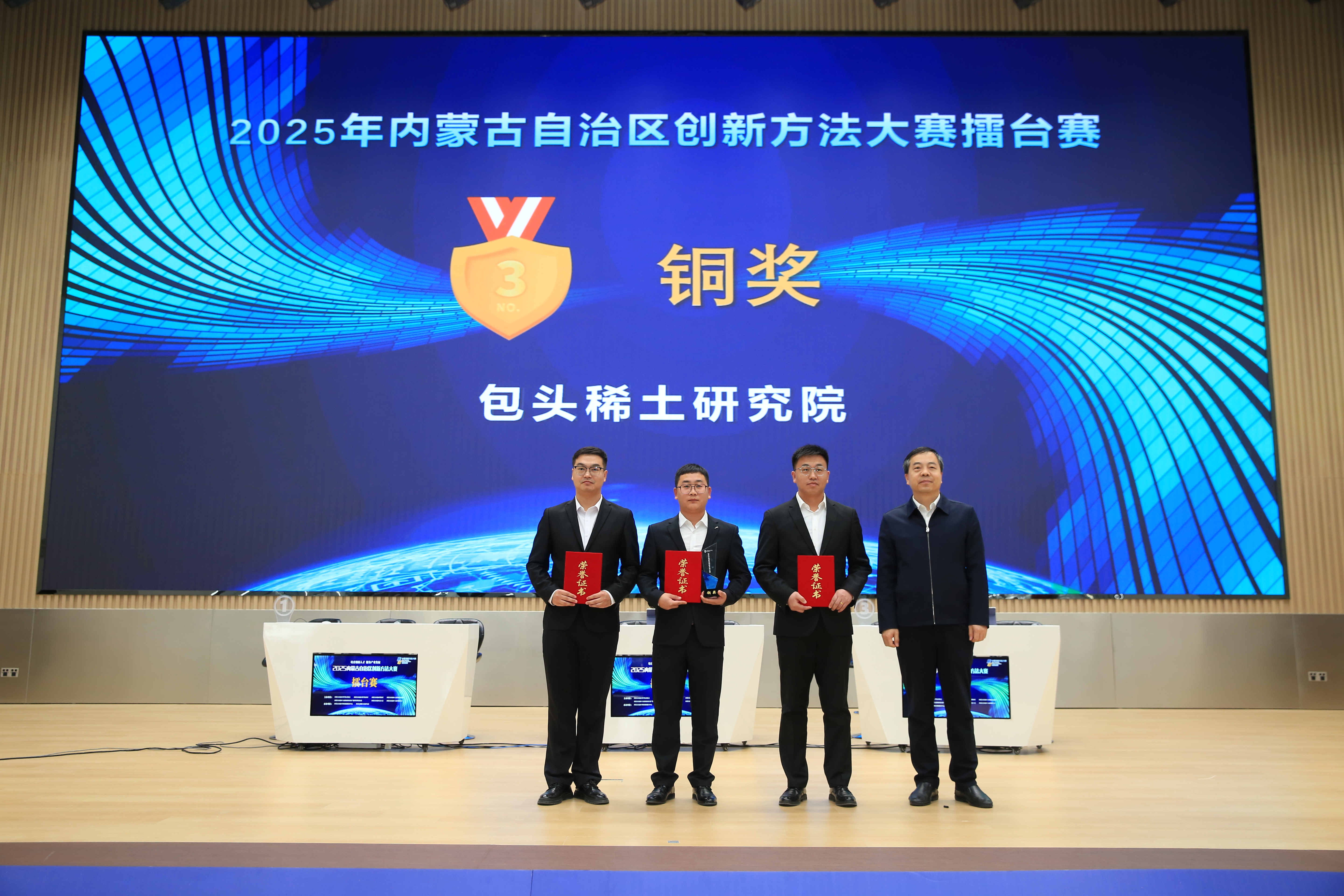 在颁奖仪式上,各主办单位相关负责同志为获得内蒙古赛区企业、高校专项赛一等奖,擂台赛金、银、铜奖的队伍,以及企业、高校专项赛优秀组织单位颁奖。